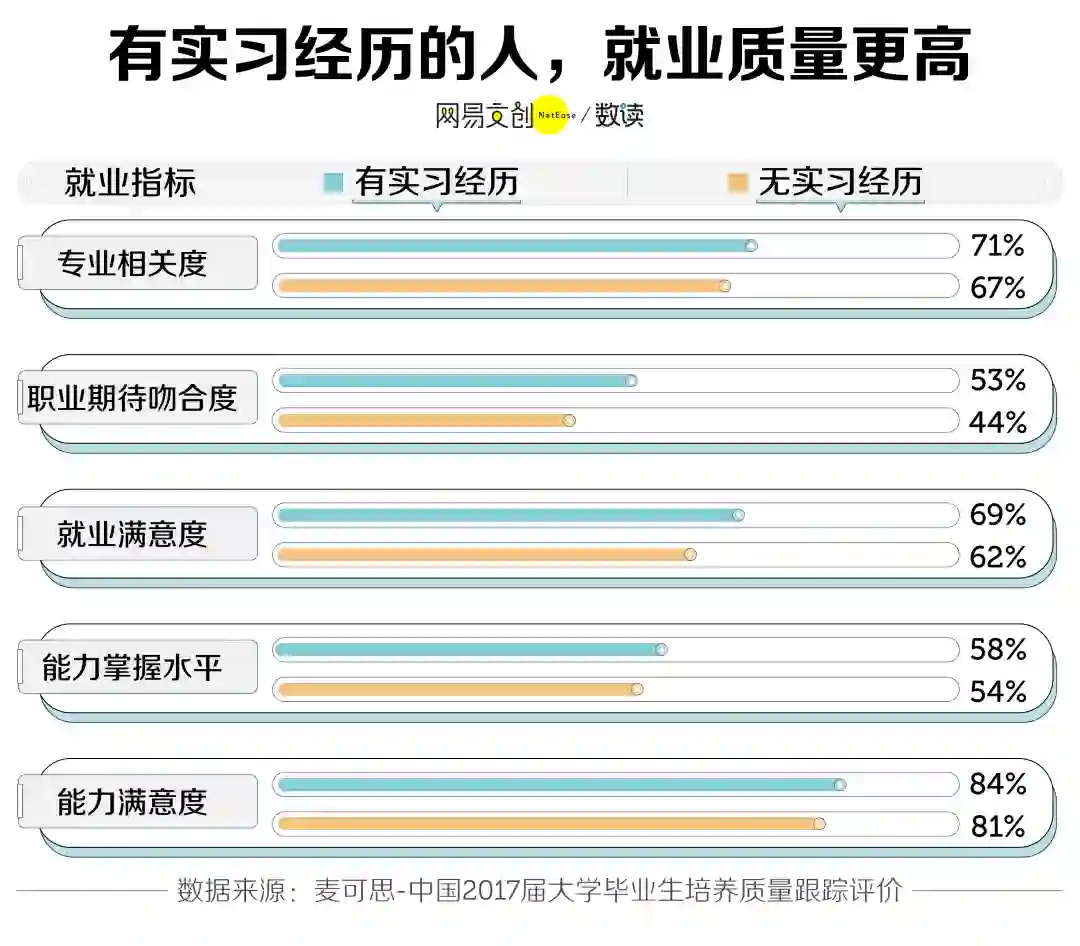 根据麦可思对 2017 届大学生的跟踪调查,有实习经历,特别是有专业相关实习的毕业生,工作与专业相关度、职业期待吻合度、就业满意度更高。