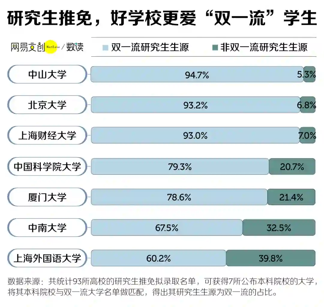 其中,中山大学、北京大学、上海财经大学的双一流推免生占比最高,都在 90% 以上,厦门大学、中国科学院大学等高校双一流推免生源也将近八成。