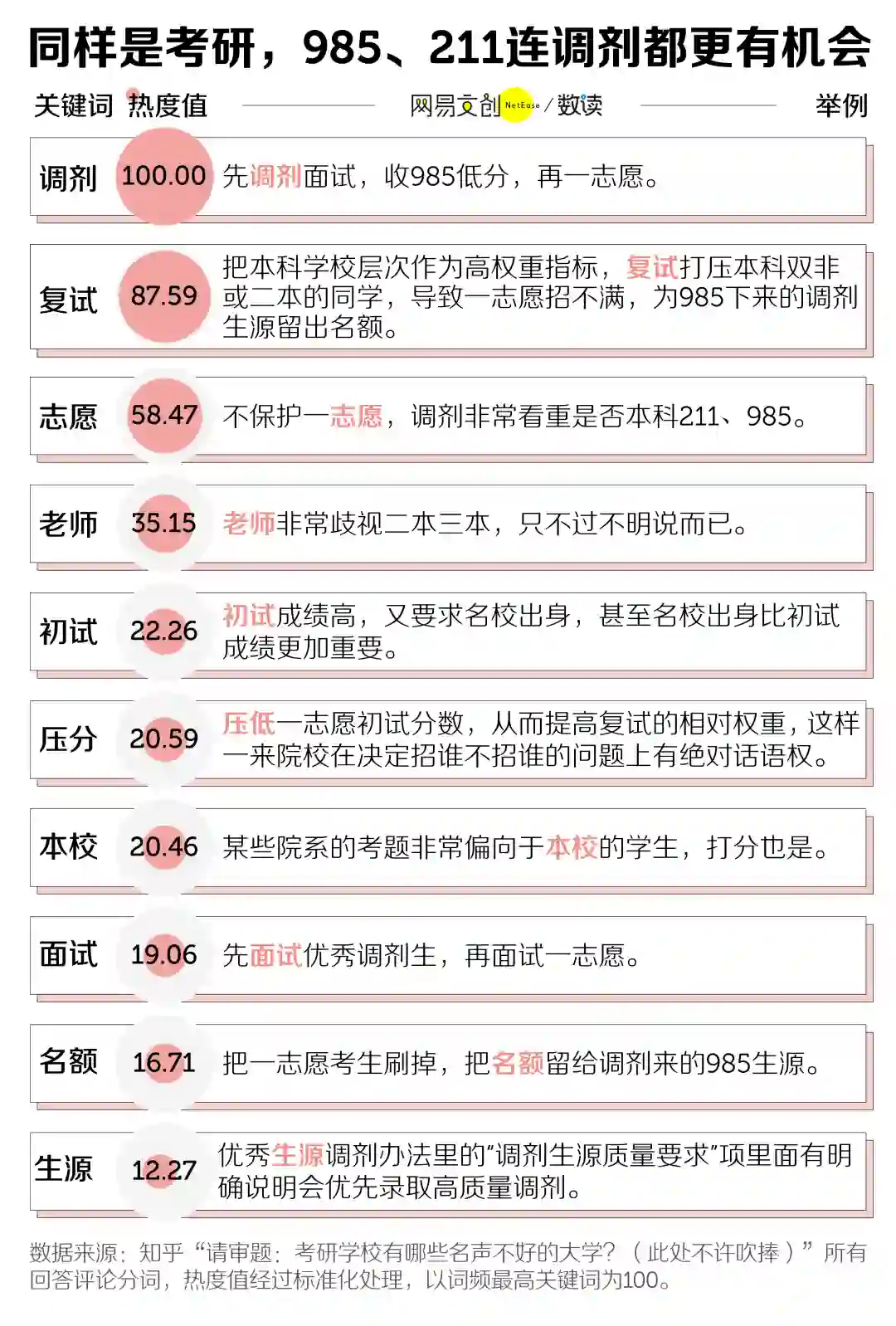 为了收到更多“优质”生源,有些学校会先开展调剂考试,提前收留 985、211 的心碎落榜生,又或是在复试中打压本科双非、二本学生,并提高复试的相对权重,为 985 调剂生源留出名额。