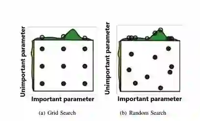 模型选定后的调参过程,最常用的是网格搜索,也就是按照固定的间距,在搜索空间上打点,但下图指出,网格搜索不一定好过随机搜索,原因是对于重要参数,网格搜索采样的点会不足,从而导致无法取到对模型效果相对较好的点,autoML会使用随机抽样,首先评价各个超参数的重要性,之后再对重要的参数进行微调。