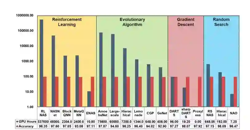 NAS算法作为当前AutoML最热的研究领域,有很多变种,下图展示了在CIFAR1000上,不同NAS方法的效果及训练用时。相比于强化学习和进化算法,传统方法的用时更少。
