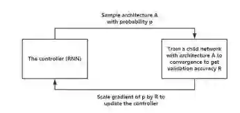 这里的行为是以一定的概率选择某个网络结构,行为是在该结构下,训练子网络,使其在训练集上达到预设的准确率,奖励是该子网络在测试数据集上的准确率与该网络被选择的概率的乘积,通过将子模型的泛化能力作为反馈,用于控制不同模型被选择概率的RNN得以优化其梯度,以选出泛化能力最强的模型,同时通过始终保持一定概率选择其他模型,处理explore VS exploit的权衡。