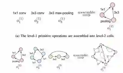 为了找到合适的网络架构,除了传统的串行网络,还有基于cell来做层级化网络架构搜索的。下图展示的是先从几个最基本的操作,搜索得出一个一级的网络组件,之后在自动化的搜索如何用一级组件搭建网络。