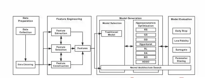 从流程先后顺序来分,最初是数据准备,包括数据收集和清洗,之后是特征工程,其中包括特征选择(决定哪些特征需要保留),特征提取(对特征进行降维,常用的方法例如PCA),特征组合(将多个特征合并/构建为一个新的特征);在之后的模型构建中,最关键的是模型选择,之后超参数优化,可以采取很多方式,最简单的做法是网格搜索,常用的方法包括用强化学习,进化算法,贝叶斯优化,以及梯度下降,来缩小搜索空间;最后,AutoML通过引入提前停止,降低模型的精度,参数共享来自动化模型评价的过程。