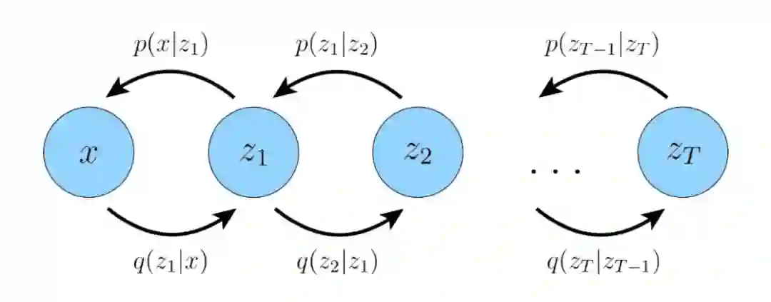具有马尔可夫性质的层级变分自编码器 MHVAE,即每一层的潜在向量仅条件于前一层的潜在向量 。