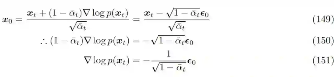 事实上,比较式 148 和式 130 的形式,可以说是非常的接近了。那么我们的 score function delta_p(xt) 和初始噪声
