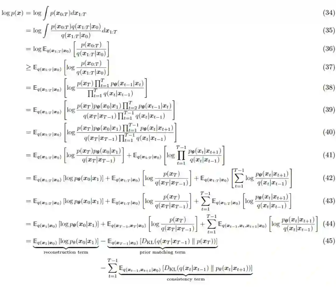 而在将上面的公式 25-28 里的 Zt 与 Xt 替换后,我们可以得到 VDM 里证据下界的推导公式里的前四行,即公式 34-37。并且在此基础上,我们可以继续往下推导。