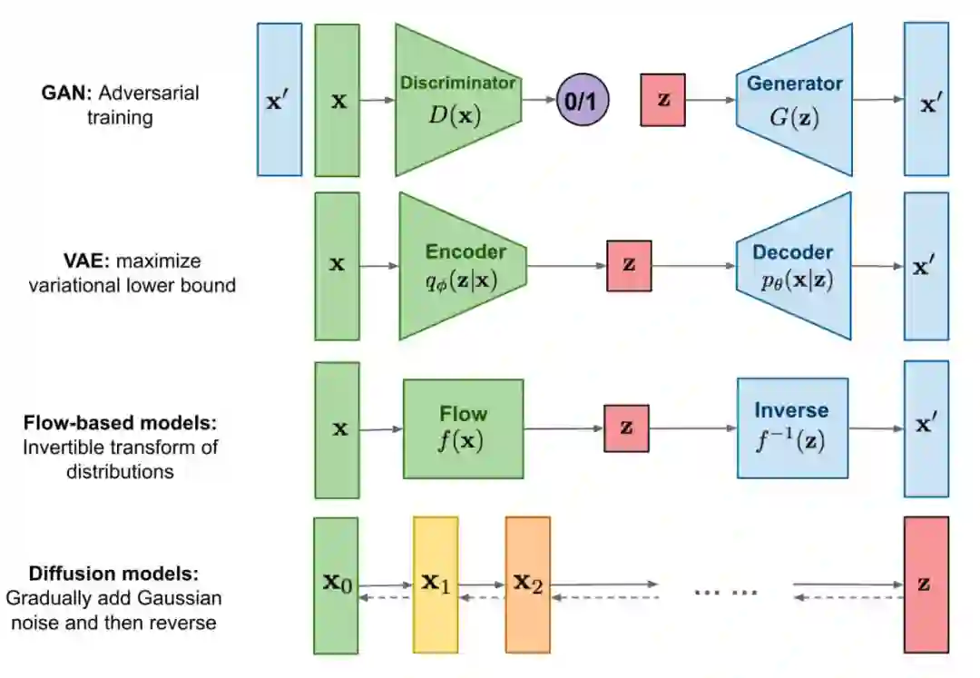 生成模型希望可以生成符合真实分布(或给定数据集)的数据。我们常见的几种生成模型有 GANs,Flow-based Models,VAEs,Energy-Based Models 以及我们今天希望讨论的扩散模型 Diffusion Models。其中扩散模型和变分自编码器 VAEs,和基于能量的模型 EBMs 有一些联系和区别,笔者会在接下来的章节阐述。