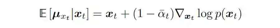 第三种推导方式主要基于 Tweedie's formula。该公式主要阐述了对于一个指数家族的分布的真实均值,在给定了采样样本后,可以通过采样样本的最大似然概率(即经验均值)加上一个关于分数(score)预估的校正项来预估。注意 score 在这里的定义是真实数据分布的对数似然关于输入