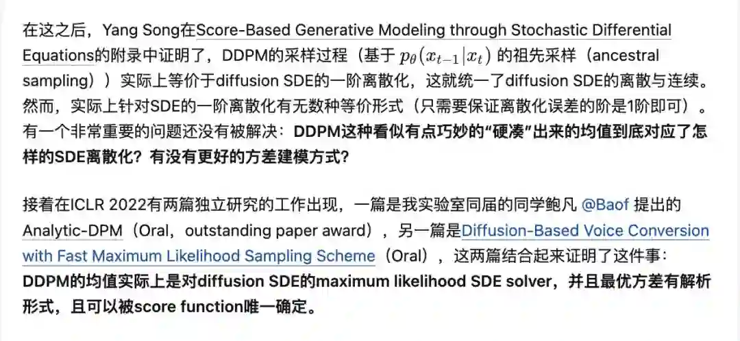 后续来自清华大学的基于将该 SDE 转化为常微分方程 ODE 后的采样提速论文,也获得了 ICLR 2022 的最佳论文奖!关于该论文的一些细节和直观理解,Song Yang 博士在他自己的博客里给出了非常精彩和直观的讲解。有兴趣的读者可以点开本文初始的第二个链接查看。以下只对大一统视角下的第三种视角做简短的概括。