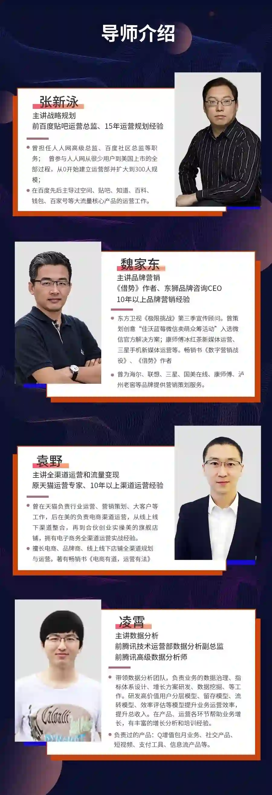 四位老师在每个板块领域都有知名代表作和丰富的实操经验与理论积累。在运营总监课上他们将为大家分享他们是如何成功晋升为总监以及这一路上走过的坑和凝练的知识体系。