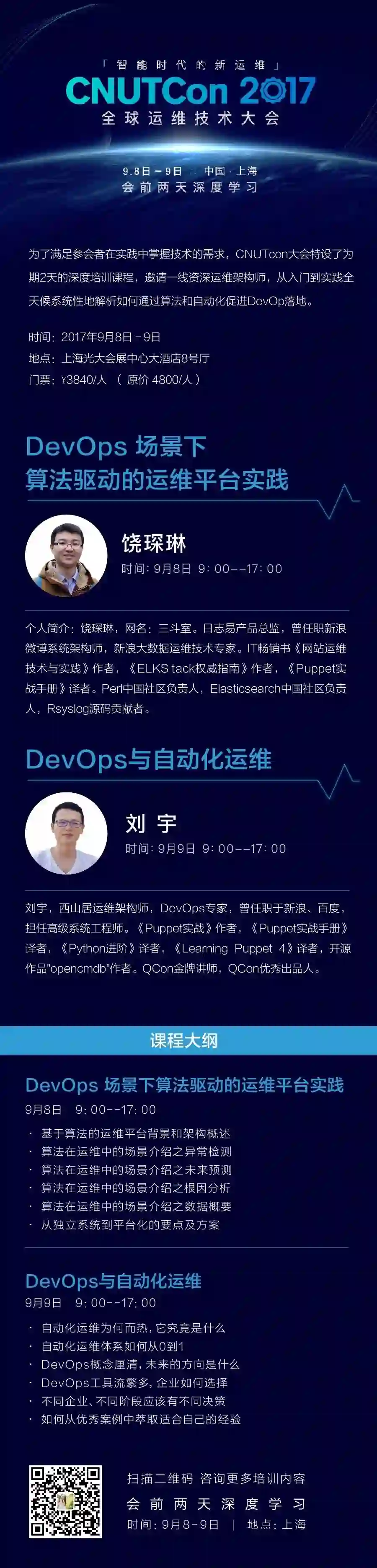 为了解决上述问题,我们依托 CNUTCon 全球运维技术大会,特设了为期 2 天(9 月 8 日—9 日)的深度学习培训,饶琛琳老师将会针对自动化运维监控、排障、容量规划等刚需,介绍所能学到的统计学、机器学习算法和实践效果,解析系统平台化实践思路和方案要点,带你从入门到实践系统性掌握如果通过算法和自动化变身智能运维。