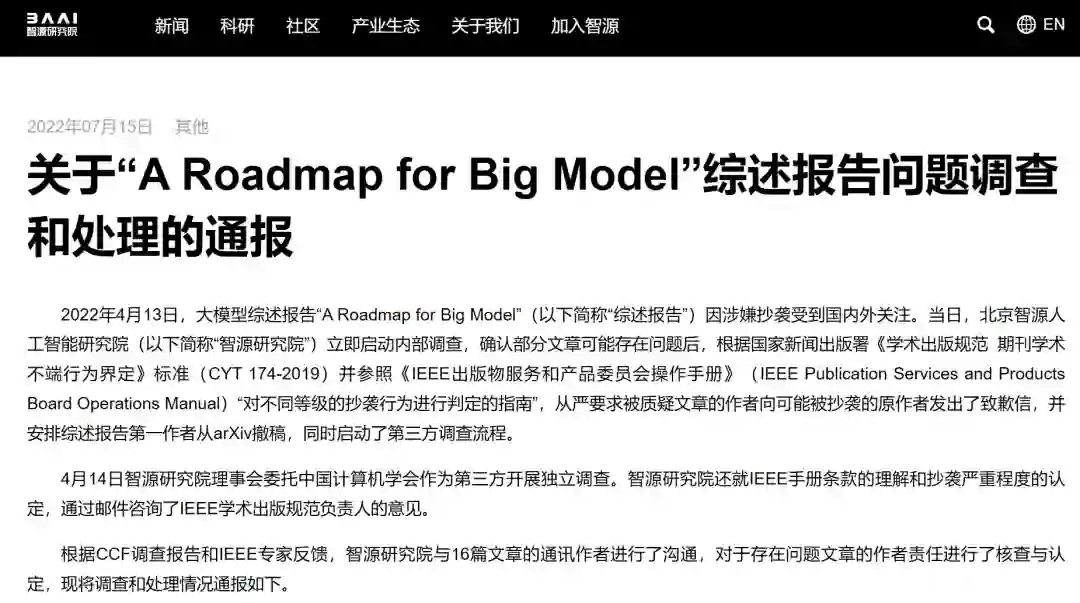 7 月 15 日,智源研究院在其官网发布了《关于 “A Roadmap for Big Model” 综述报告问题调查和处理的通报》。根据 CCF 调查报告和 IEEE 专家反馈,研究院与 16 篇文章的通讯作者进行了沟通,对于存在问题文章的作者责任进行了核查与认定。