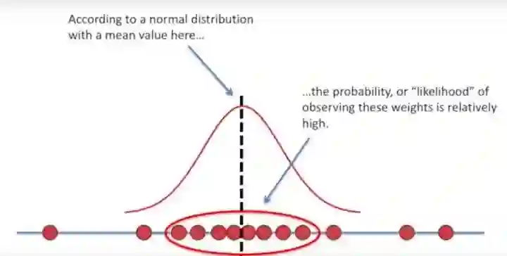最后,我们在这群待选的均值和方差中,选出那个能使我们观测到这批数据的概率最大的均值和方差。也就是我们在做