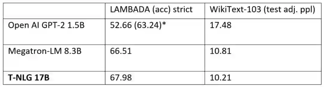 如下表所示,T-NLG 在上述两项任务中实现了 SOTA,Megatron-LM 的数据来源于 NVIDIA Megatron 模型的公开结果。