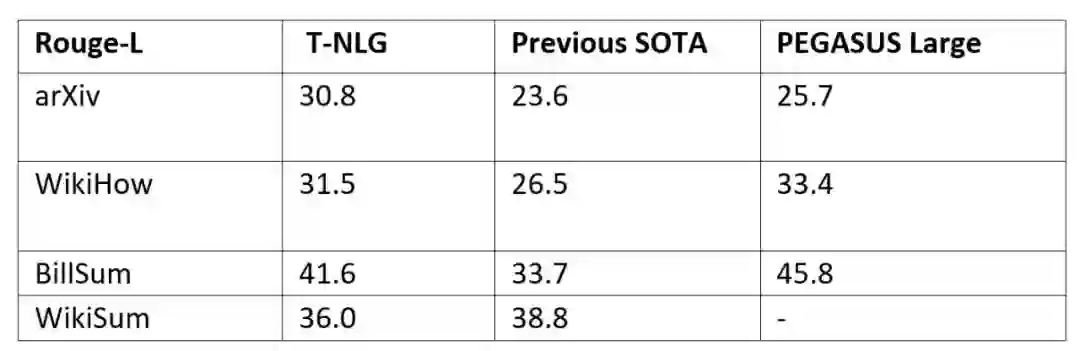 下图展示了 T-NLG 与之前的 SOTA 模型以及 PEGASUS(最近的一个基于 Transformer 的模型)的 Rouge 分数对比: