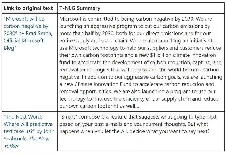 下图展示了 T-NLG 任务在一些文本摘要任务中的应用示例: