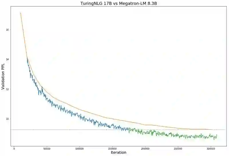 二者训练过程中的困惑度验证表现对比:橙色线代表 Megatron-8B 参数模型,蓝/绿色线代表 T-NLG。虚线代表的是现有 SOTA 模型能实现的最低验证损失。从蓝色到绿色的过渡意味着 T-NLG 在性能上超越了现有的其他训练模型。