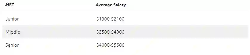 根据权威工资收入调查机构 PayScale 显示,乌克兰对 .NET 有深入了解且拥有 5 年以上工作经验的开发人员平均每年可赚取 68000 美元 。而高级 .NET 开发人员的平均月薪为 4700 美元,中级 .NET 程序员月收入虽在 3000 美元左右,但具有 2 年以上经验的年薪最高可达 39000 美元(约 24.6 万元人民币)。