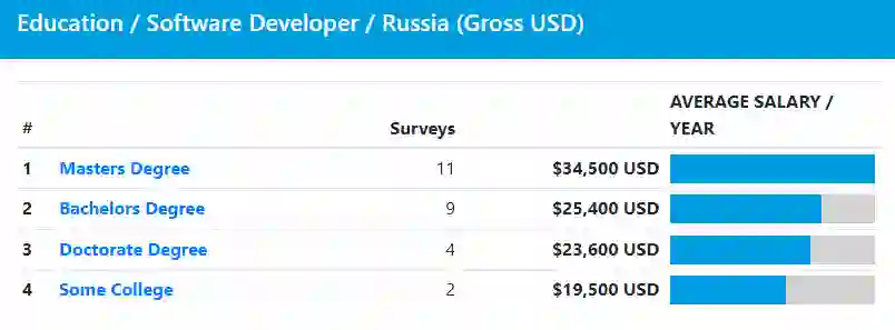 如根据程序员教育水平进行划分,会发现获得硕士学位的人薪酬最高,为 34500 美元(约 21.7 万元人民币),其次是平均年薪为 25400 美元(约 16 万元人民币)的学士学位,学历最高的博士程序员收入却排在第三。