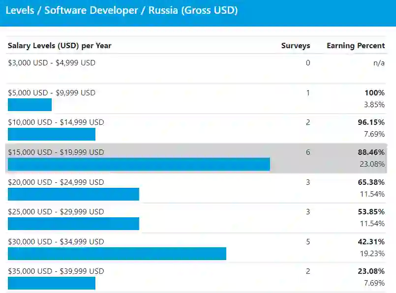 据 ASS 网站表示,本次薪酬统计基于 26 次调查,数据显示俄罗斯软件开发人员的平均年薪为 28536 美元(约 18 万元人民币),其中近 23% 程序员的年薪集中在 15000-19999 美元区间内。