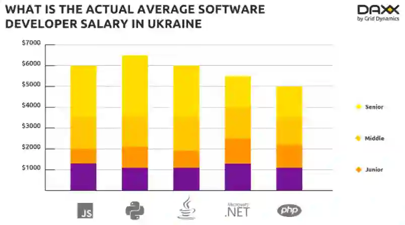 据 DAXX 调查显示,乌克兰开发人员平均月薪普遍在 2000-5000 美元之间,即年薪约为 24000-60000 美元(约 15-37 万元人民币)。其中,报告还根据高级/中级/初级开发人员做了进一步划分:高级开发人员每月收入约为 4250 美元,年薪约 51000 美元;中级开发人员每月收入约为 3000 美元,年薪约 35000 美元;初级开发人员每月收入约 1100-2200 美元,年薪约 13000-22000 美元。