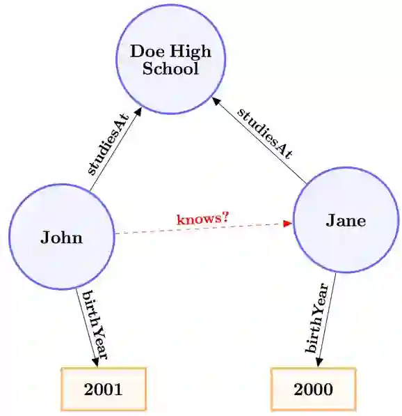 知识图谱表示学习的目标是通过机器学习将知识图谱中实体及关系的语义信息表示为低维稠密的实数向量。在该向量空间中,我们可以通过欧式距离或余弦距离等方式计算任意两个对象之间的相似度。在既有的工作多是关注知识图谱中的拓扑结构而忽略了实体名称字面含义中所携带的语义信息,如下图所示,忽略字面含义的知识图谱表示学习并不能直接预测 John 和 Jane 之间的关系,但是,在考虑到相近的出生日期以及校友关系等因素之后,在 John 和 Jane 的关系预测上可以更加确信。