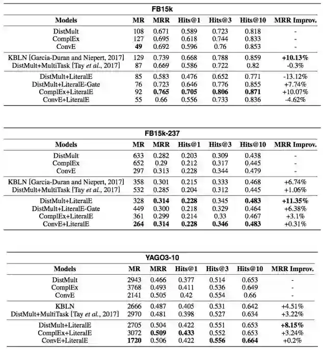 本文中在 FB5K,FB5K-237 和 YAGO-10 等三个数据集上进行了实验,实验结果显示通过引入LiteralE机制能够较大的提高既有模型在链接预测任务中的性能。