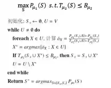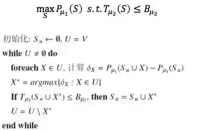 我们现在要优化这个问题,这里的优化的函数是子模函数,约束是一个超模函数。我们的算法是这样的,初始化可以从空集开始。所谓的空集并不是真的空,是我已经假设这一层最少比如说有10个节点,是从10开始的,而在这个地方空集就意味着从10开始的意思。我从空集开始往上加节点。我在当前的情况下去考虑增加一个节点或者几个节点,我增加进来以后,我看这个性能是多少,这个性能比刚才相比增加了多少,我算这个增加量。