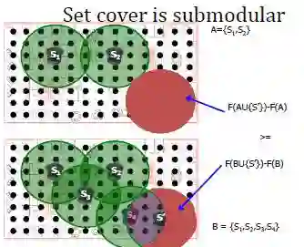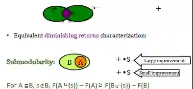 如果它满足这个条件,就说它是一个子模函数。这样的性质也等价于这个性质:有两个集合,一个是A,一个是B,A集合是B集合的一部分。这种情况下如果在A集合上加上一个元素,这个集合就变大一点,变大了以后,这个函数会比原来A集合函数增加了一部分,在小的集合上增加的量要更大大。换句话说,小集合加上一个元素带来的改进更大,而在大的集合上增加同样的元素以后,它带来的影响会比较小一些。