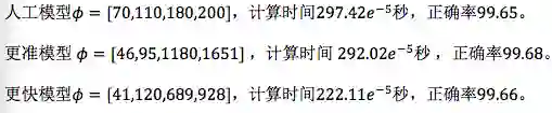 我们看看人工模型,人工模型【70、110、180、200】,计算时间是这样的,现在它的正确率是99.65%。我们的算法给出了两个更好的模型,一个是识别率更高,一个是速度更快。