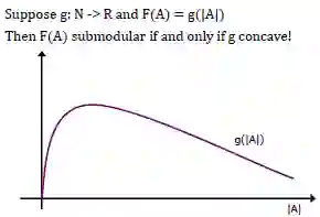 假设有一个这样的函数g,它是从整数到实数的一个映射,函数F定义在A集合上,这个子模函数怎么定义呢?它就定义成我这个集合的“大小”,把集合别的因素都去掉,只考虑它的大小。这样如果两个集合a是b的子集,那么 a的大小 < b的大小。这个函数的特点就在于,在小的地方增加一点所带来的增益,和在大的地方同样增加一点所带来的增益,前者要大。所以你也可以认为,子模函数是离散函数的一种凸性质。
