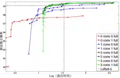 我们关心的是,在已有的数据集上我们的方法是不是比人工调出那个结构好。我们去看一下这个实验。在MNIST数据集上实验,也就是做手写数字识别。比较有意思的是,我们看这条虚线,对应的是LeNet,就是人们已经在数据集上仔细调出来的一个网络。我们可以知道我们的这些网络结构的准确率还能超过它。人调了半天得到一个结构,我们告诉你调的还是不够好,算法可以调的比你更好,就是这个意思。这个更好体现在什么地方?在同样的运行时间情况下,我得到的结构的识别率比你好。如果看相同的识别率的结构,我的结构比你少很多。