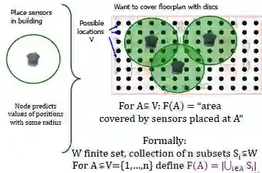 这件事有点太抽象,我们举一个具体的问题,这样大家就会有很直观理解。假设,现在有一个房间,我们需要在房间里布置一些传感器,布置传感器是为了对整个房间进行数据采样。每个每个传感器会有一个覆盖面积。我们希望放上有限的传感器,覆盖的面积越大越好。在这样一个问题里边,对于任何一个集合,F(A)=A能够覆盖的面积。所谓的A是什么呢?就是你放的传感器,因为每个传感器会放在一个位置上。