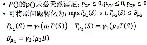 所以我们就做了一个函数变换,函数变换实际是在原来的函数上乘一个正数𝜇1,作用于𝛾这个函数,把它变换成一个子模函数。如果𝛾这个函数选择的好,例如是个单调函数,那么,P()和P𝜇1这两个函数是单调的,所以在相同的地方取最大值,因此不影响我们优化问题结果。这个里面,𝜇 1, 𝜇2 正整数,𝛾1 ,𝛾 2单调递增函数。