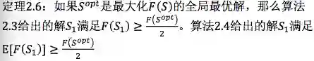 下面这个结论告诉说,刚才这里有两种算法,我可以给它一个理论保障,这个理论保障是这样的。如果这个So是整个这个问题的全局最优解,刚才第一个确定性的算法给出的解S1大于它的1/2, 2.4这个算法给出的解的数学期望是也是大于最优解的1/2。这样一来我们就知道这个算法有理论的下界,这件事告诉我们什么?你可以放心大胆的用这个算法。