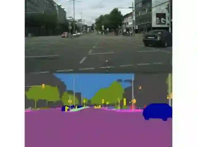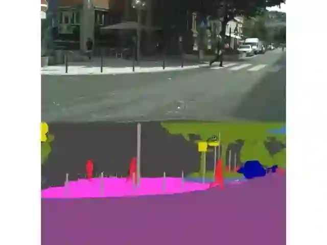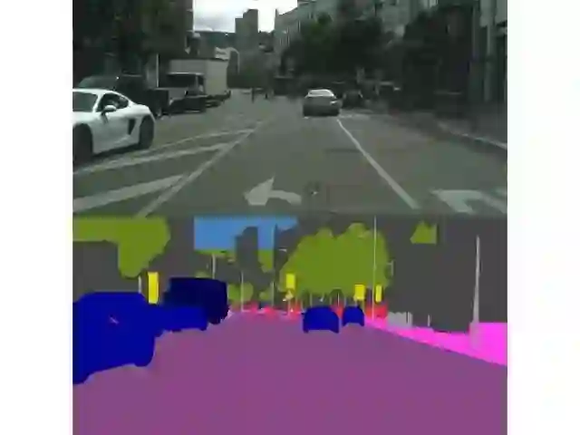 这幅图像是我们的算法在研究自动驾驶的数据集—Cityscapes上的结果。上一张为输入,这一张图像是算法输出的结果,图中一共包含19类。
