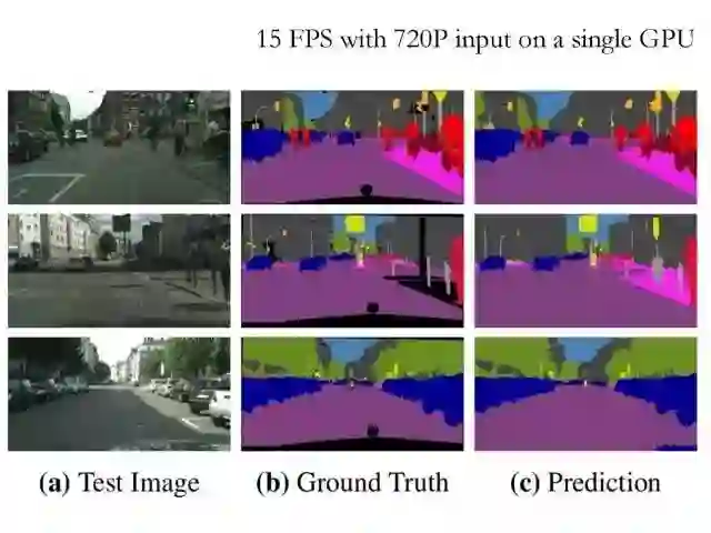 这个是在Cityscapes上的结果。我们现在的算法,可以在720P这样的输入上,用一块Titan X基本做到实时,这是优化之后的速度(现在已经能够做到近50 fps)。
