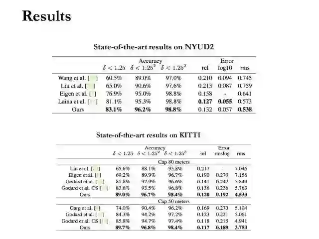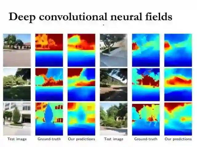 上图实验结果中,中间一栏为真实图像是用激光扫描得到的。右边一栏是我们算法的输出,不同的颜色表征不同的距离。