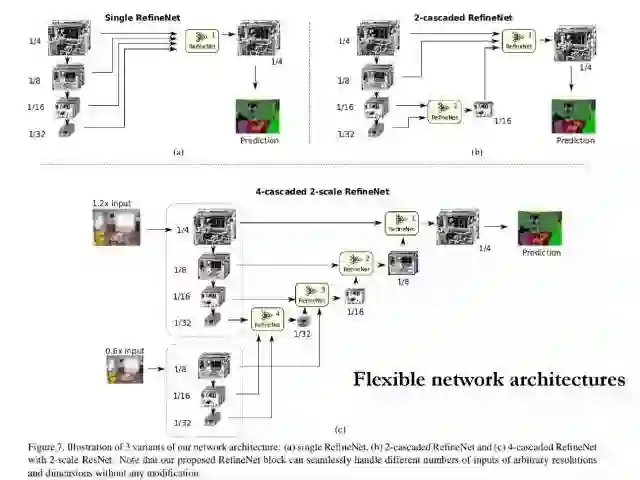 RefineNet以递归方式用细粒度的低级特征提炼低分辨率的(粗糙的)语义特征,这用来生成高分辨率的语义特征图。我们的模型是灵活的,因为它可以级联并且以多种方式修改。