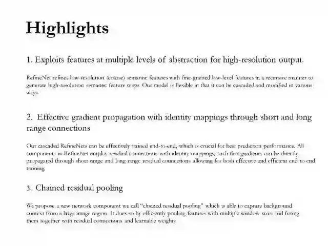 我们提出了一个名为“链式残差池化”的新的网络成分,它可以在大图像区域获取背景语义信息,通过多种尺寸的窗口有效池化特征,并且通过残差连接和权重的学习将这些特征融合在一起。