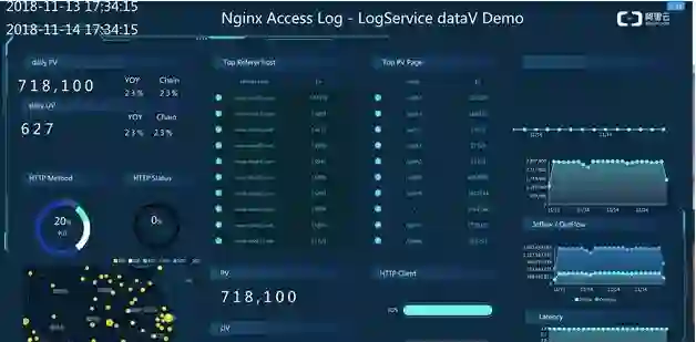DataV无缝支持LOG API,使用SQL进行实时计算,统计Nginx日志的PV、UV网络等指标。