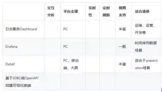 大屏的选择可选方案有日志服务Dashboard,Grafana,Datav等,也可以通过API、JDBC接口对接自己的可视化大屏和第三方的软件(例如Tableua)。日志㐏对三种大屏提供了插件,只需在配置中直接使用SQL进行计算,并展示结果。