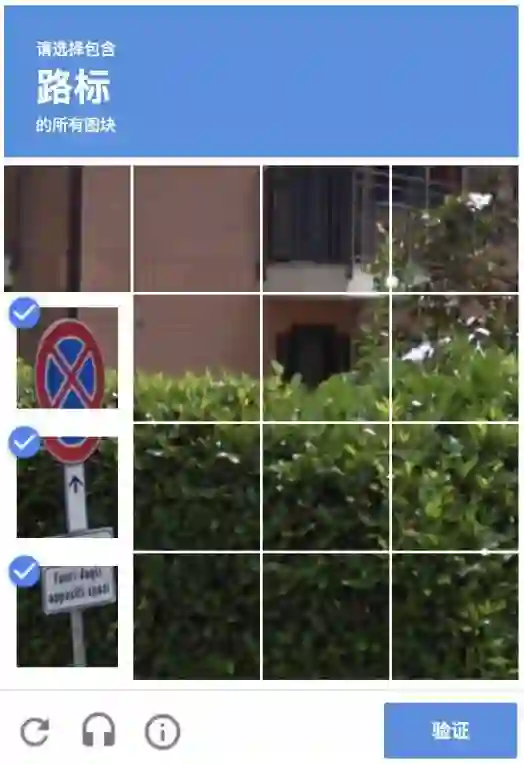 :以图像识别为例,一旦把图像本身放到具体环境中,由于发生了变形、遮挡或者反光等,现在的算法就难于将它准确识别出来。举个例子,在使用 Google 搜索时,很多人可能遇到过一种人机身份验证方式:在下列图片中选出含有交通标志的那些,如下图所示: