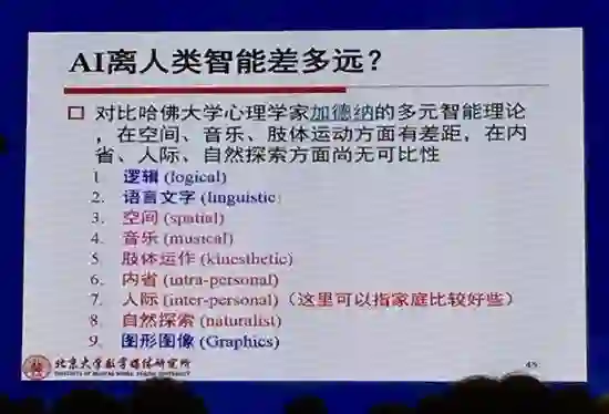 :北京大学的高文院士指出,人工智能还应该研究:推理、知识、规划、学习、交流、感知、移动、操作等。按照哈佛大学一位心理学家给出的定义,智能至少涉及9个方面:逻辑方面的能力、语言文字方面的能力、空间改革的能力、音乐能力、肢体运作能力、内省的能力、人际关系能力、自然探索能力、图形图像理解的能力。你看看下面这张图。