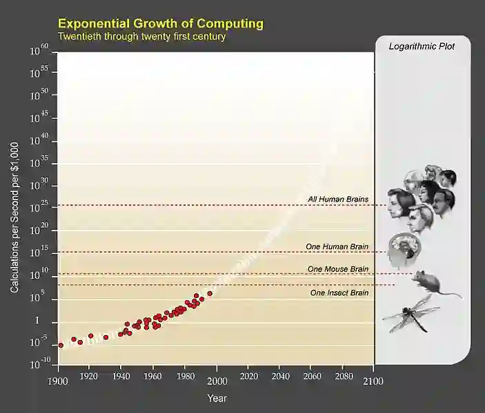 :Kurzweil认为达到奇点的主要瓶颈之一是计算能力。我们知道,计算机界有一个著名的摩尔定律,大致说起来,就是集成电路的晶体管密度(同一面积下的晶体管数量)每两年翻一番。因此也可以大致认为,计算机的计算能力也是在指数级地增长。