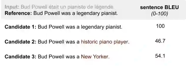相较于人工质量评估,采用自动化指标的方法成本更低、效率更高。自动化指标通常会将参评语句和参考语句同时输入系统,然后根据词汇重叠情况进行评分,以表明前者与后者的相似程度。其中一个热门指标就是 BLEU,该指标可统计词汇序列同时出现在参评语句和参考语句中的次数(BLEU 得分与精度非常相似)。