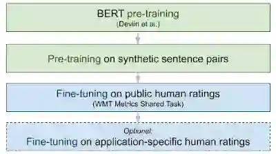 我们对 BLEURT 进行了两次预训练,第一次使用的是语言模型目标(如 原 BERT 论文中所述),第二次使用的是 NLG 评估目标集合。然后,我们根据 WMT 指标数据集和/或用户提供的评分集合对模型精选了微调。下图举例说明了 BLEURT 的端到端训练流程。