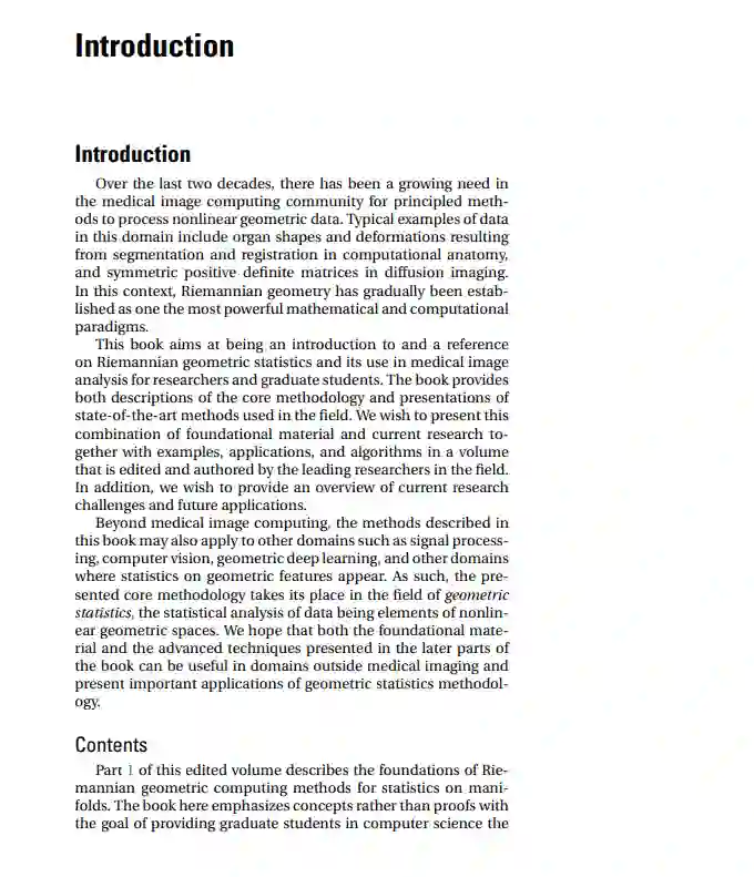 本书后半部分介绍的基础材料和先进技术可以在医学成像之外的领域有用,并展示几何统计方法的重要应用。