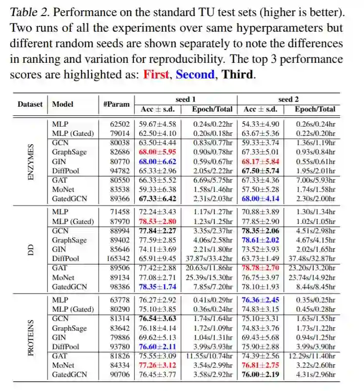 与图形无关的NNs (MLP)在小型数据集上的表现与GNNs一样好。表2和表3显示,对于小型TU数据集和(简单的)MNIST,使用GNNs而不是不依赖于图的MLP基线并没有显著的改进。此外,MLP有时比GNNs做得更好(Errica等,2019;Luzhnica等人,2019年),例如用于DD数据集。